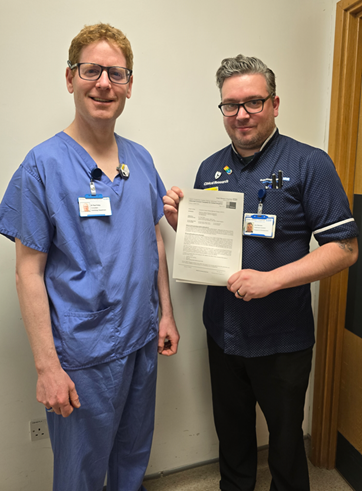 Pictured alongside the success of the CSPOT trial are Principal Investigator and Consultant Cardiologist Dr Paul Foley and Clinical Research Assistant Joe Stevens, who were instrumental in delivering the study at the Trust.